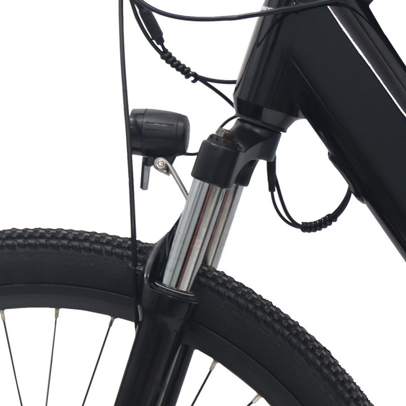 Its 29-inch wheels ensure good grip and stability on various terrains, while the 7-speed system allows you to adapt your pedaling effort to road conditions. The bicycle is finished in an elegant black color and features an adjustable frame height, allowing you to customize the fit for greater ergonomics and comfort. It features a standard European (EU) plug, making it easy to charge at home or in equipped public charging stations.