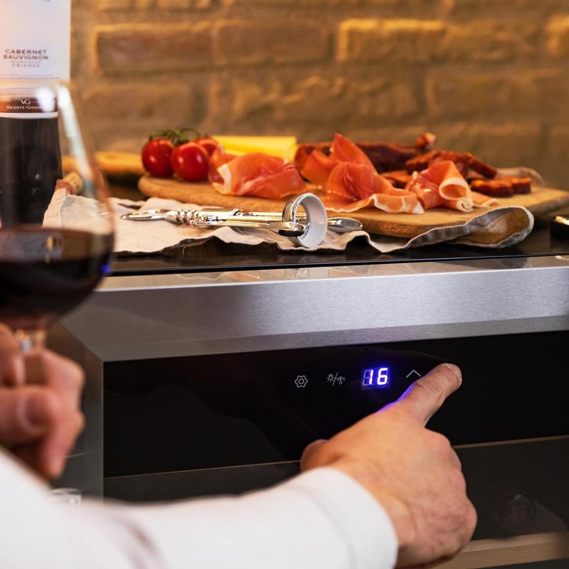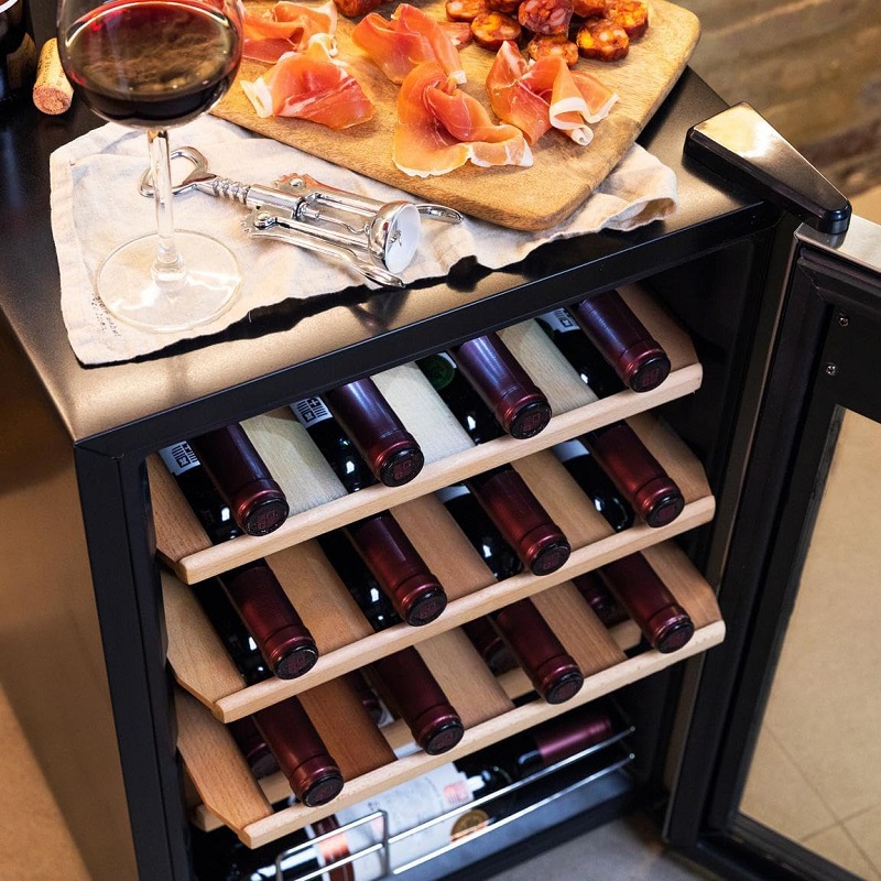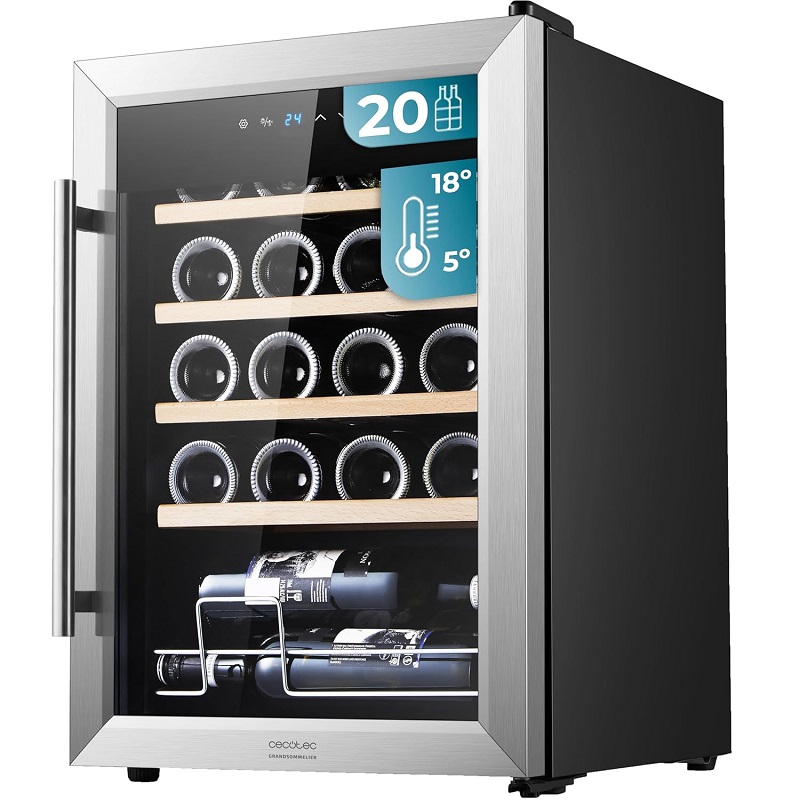 It can hold up to 20 bottles. Enjoy its spacious interior and store your favorite wines to enjoy whenever you like. High performance. The wine cellar is equipped with a compressor that ensures low noise levels and high performance, so your wines are always kept in optimal conditions. Quiet and vibration-free operation. The wine cellar generates only 39 dB of noise, guaranteeing quiet and vibration-free operation.