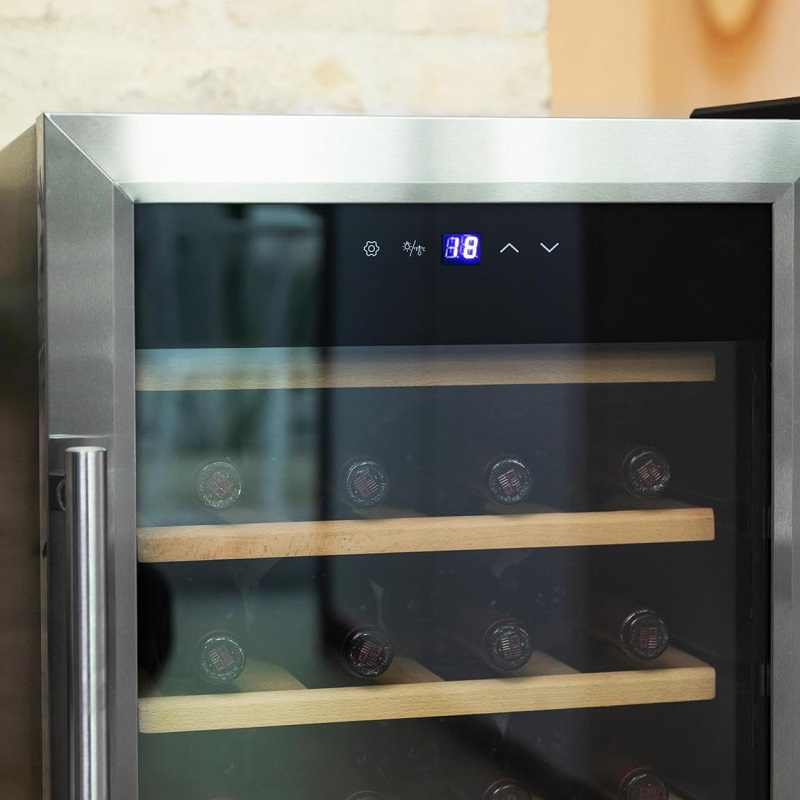 This wine cellar features a stainless steel door and handle, a 24-bottle capacity, a refrigeration compressor, an adjustable temperature range of 5 to 18°C, and a touch control panel.