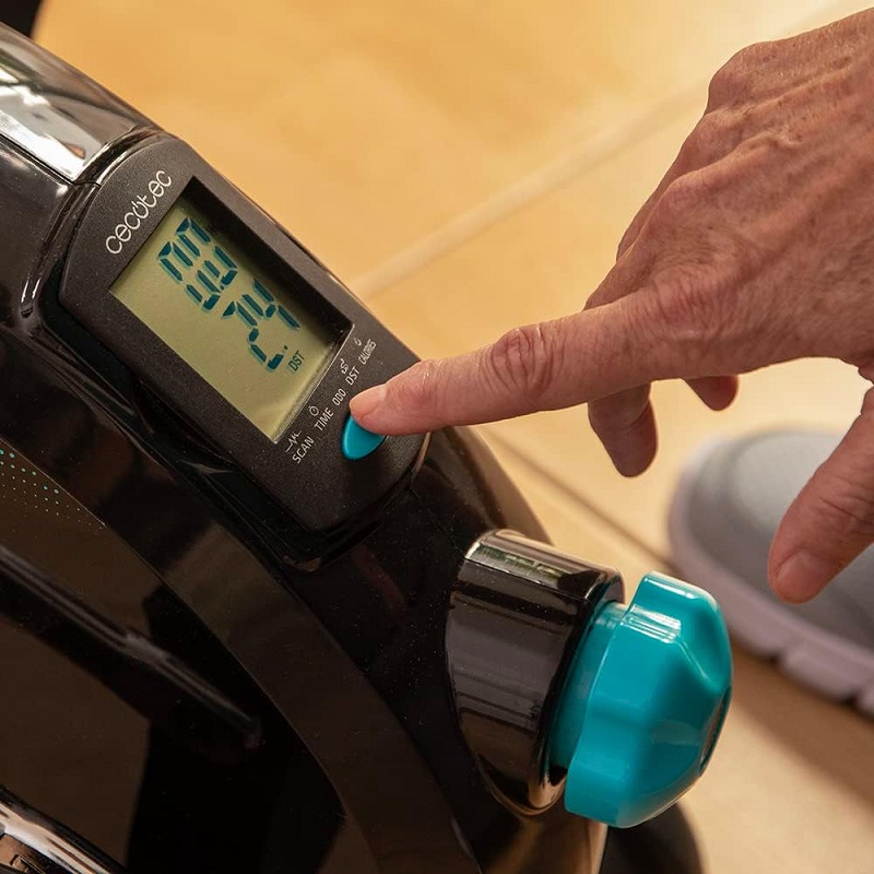 High-visibility LCD screen displays time, speed, calories, distance, and scan mode.