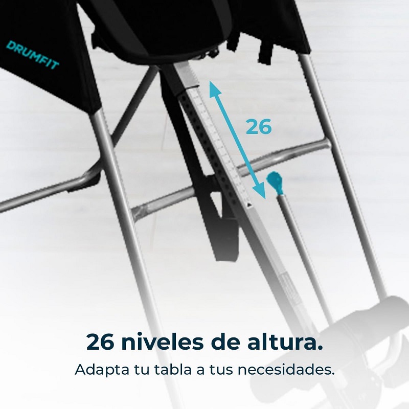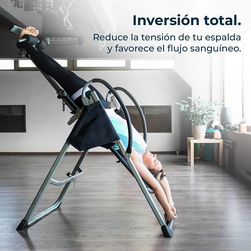 Folding inversion table with full 180° inversion. Safety belt and foam padding. 26 adjustable levels. Maximum user weight: 120 kg.