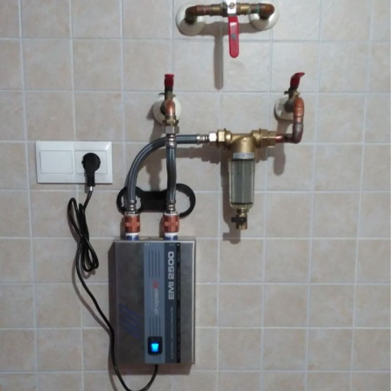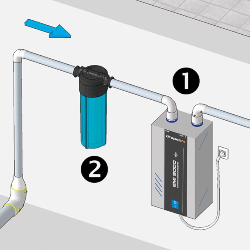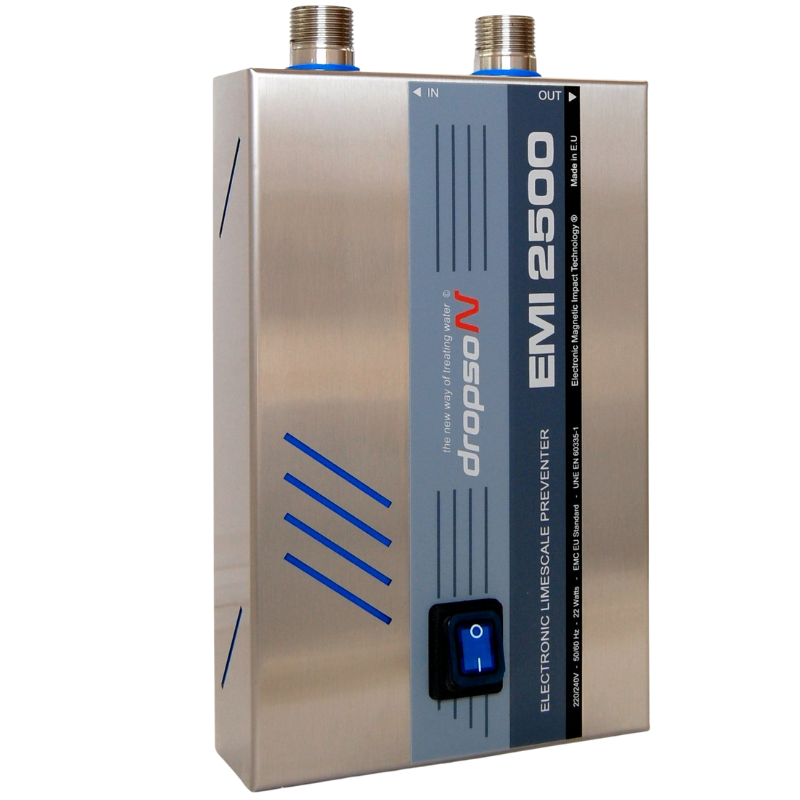 Electronic domestic water softener, maximum flow rate of 2.5 m3/h, Dropson EMI electronic descaling system for domestic hot water (DHW) and cold water systems, particularly suitable for residential and commercial installations, swimming pools, and fountains. Dropson recommends installing a sediment filter before the descaling system.