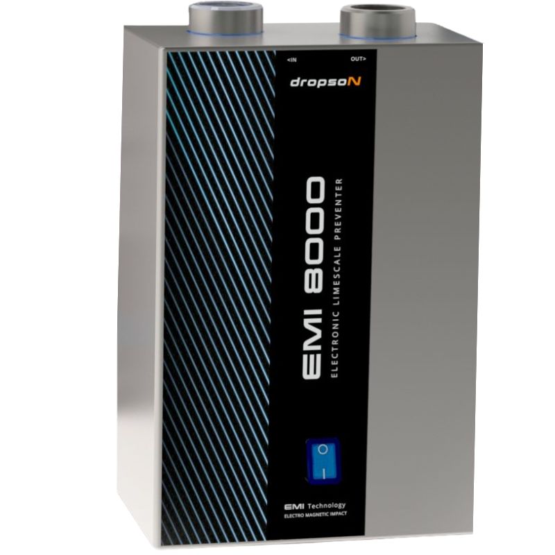 The Dropson EMI 8000 magnetic water softener, with a capacity of 9 m³/h, features a satin-finish stainless steel housing and chassis. This next-generation electronic water softener operates without salt, requires no maintenance, and eliminates water waste. It is designed for installation in factories, businesses, and homes.