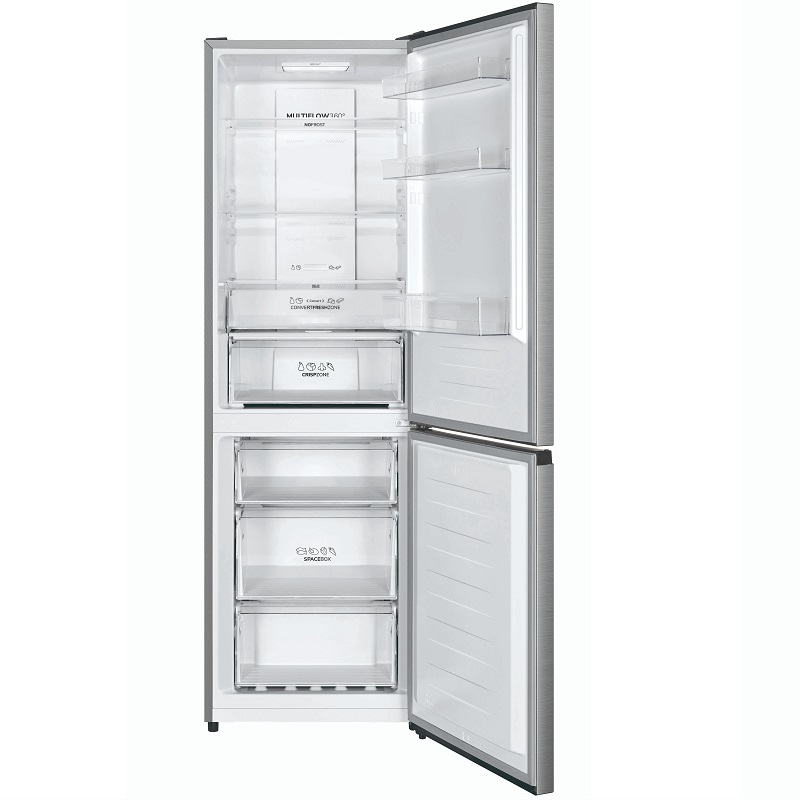 With a total capacity of 304 liters, this model offers a balanced layout: a generous refrigerator compartment for fresh produce and a lower freezer compartment for easy access to frozen foods. The glass shelves are sturdy and easy to clean, supporting heavy containers and offering excellent visibility of their contents. Interior LED lighting improves food visibility and reduces shadows.