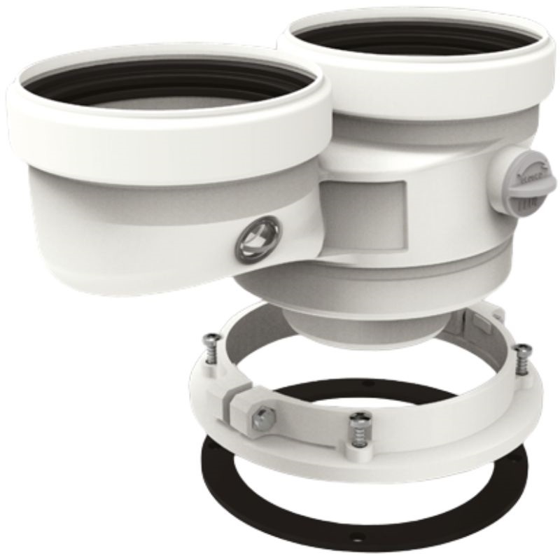 Coaxial adapter for dual-flow boiler outlets, compatible with Domusa, Fondital, and Wolf boilers. Made of polypropylene with gaskets. Features air and flue gas intake ports on each side.