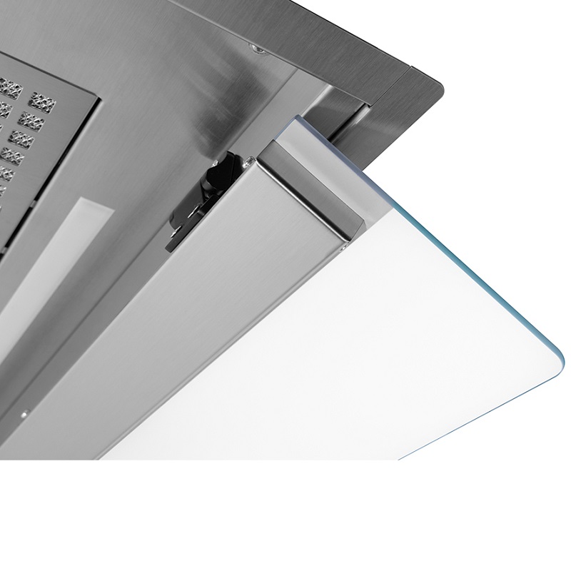 The Frecan Note integrated hood, made entirely of stainless steel, is fully integrated under the cabinetry, remaining completely invisible. Thanks to its drop-down visor, this hood model allows for perimeter extraction (with the visor closed) or traditional extraction (with the visor open), with the latter providing better extraction when used with the front burners of the cooking zone.