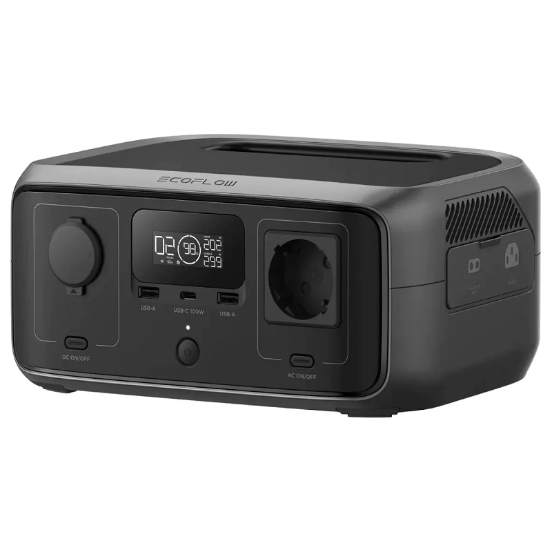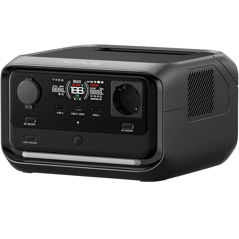The EcoFlow RIVER 3 UPS portable solar generator is a compact and robust device designed to provide a reliable power source in any situation. Equipped with a lithium-ion (Li-Ion) battery, this portable generator offers a maximum output of 600W and a rated output of 300W, sufficient to efficiently power basic electronic devices and USB devices. Its design incorporates an integrated display for easy real-time monitoring of battery status and power output, thus optimizing management during use.