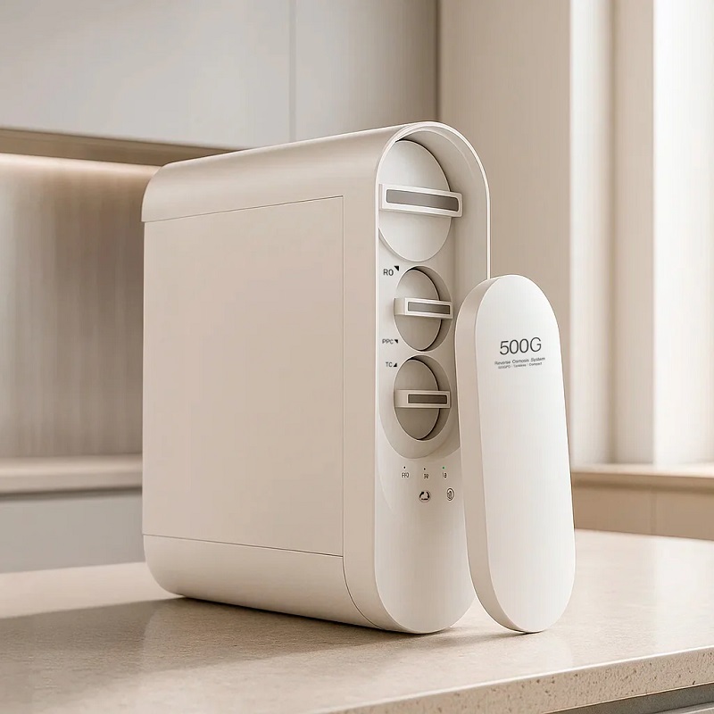 Water Purifier: The GALYON GENIUS D500 water purifier features a 5-stage reverse osmosis system. It produces 1.5 to 1.7 liters per minute and has a filtration capacity of 500 gallons per day (GPD) with a salt rejection rate exceeding 90%.