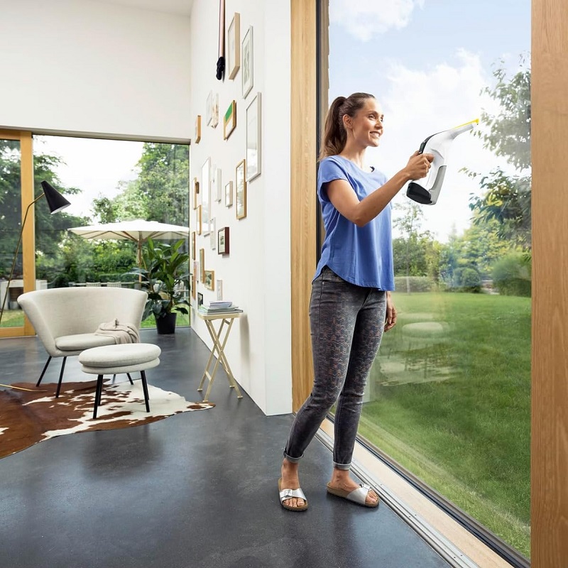 As usual, the clever combination of sprayer and microfibre bonnet as well as the suction function of the window cleaner guarantee highly effective cleaning and sparkling windows, without streaks or residue. In addition, the ergonomically designed WV 6 Plus cordless window cleaner enables particularly hygienic window cleaning, as the user never comes into direct contact with the dirty water.