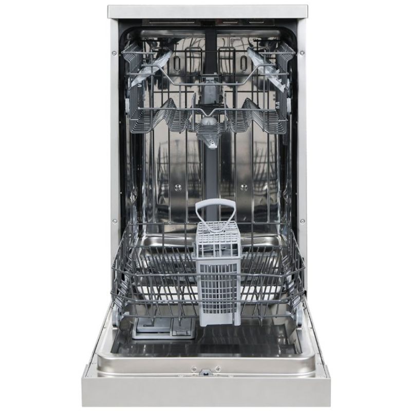 Stainless steel design with 2 trays and a cutlery basket. Electronic control system with LED display and 6 wash programs and functions for optimal results and optimal care of your dishes.