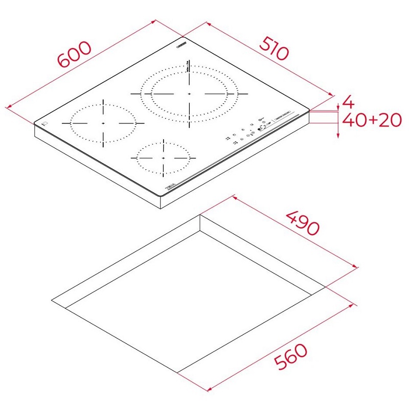 Thanks to its standard dimensions, this cooktop is easy to install. With a width of 600 mm, a depth of 510 mm, and a height of 64 mm, it fits perfectly on most standard worktops. Its intuitive mounting system reduces installation time and facilitates seamless integration into your kitchen.