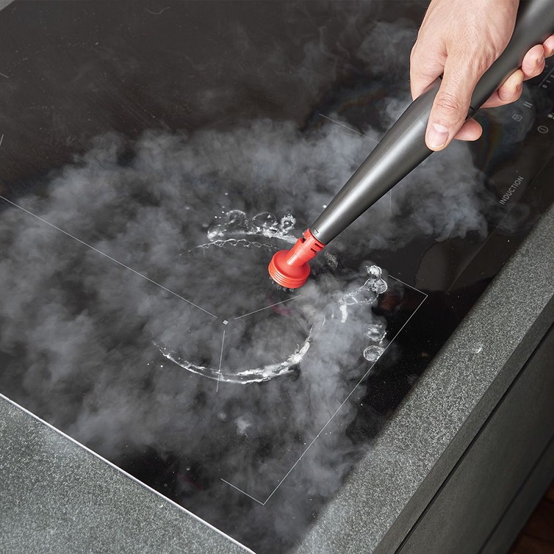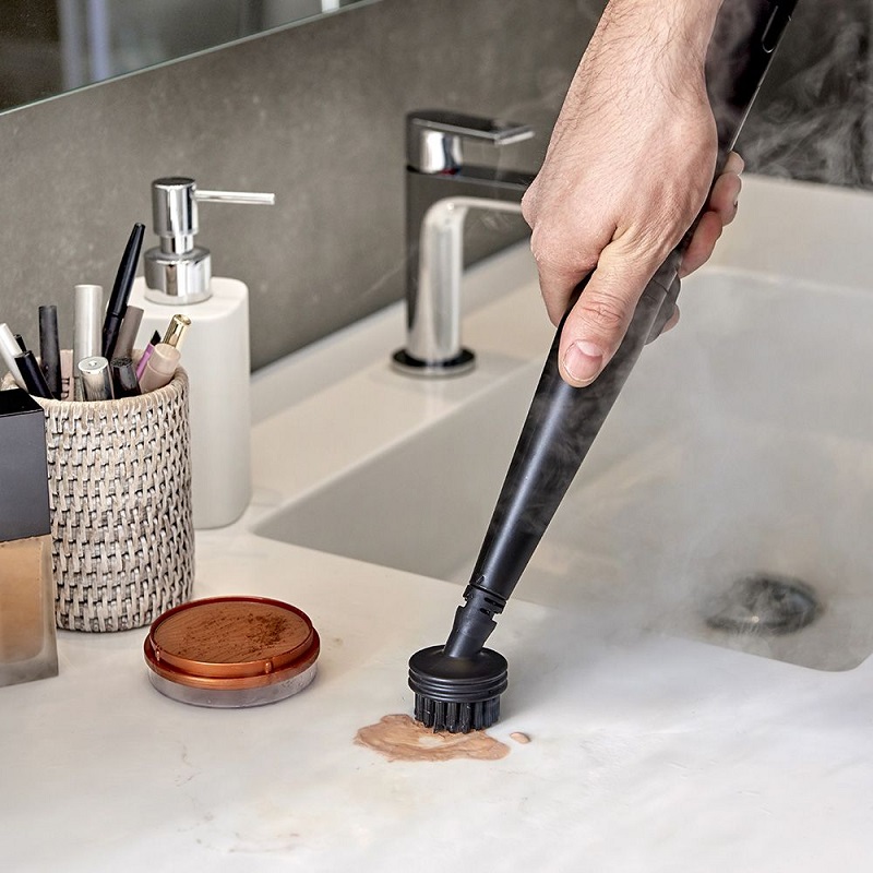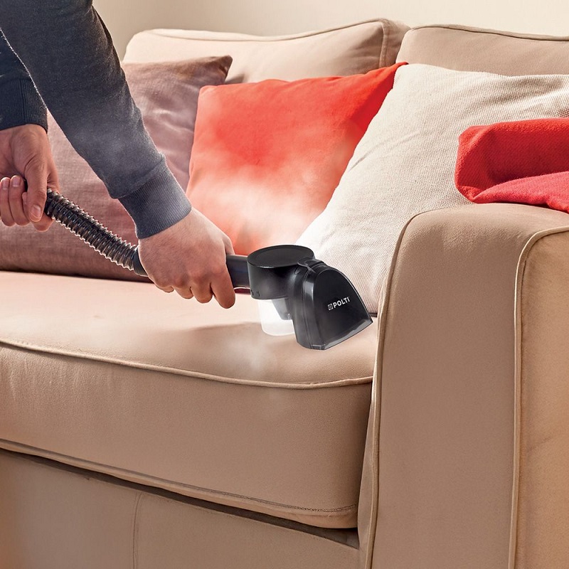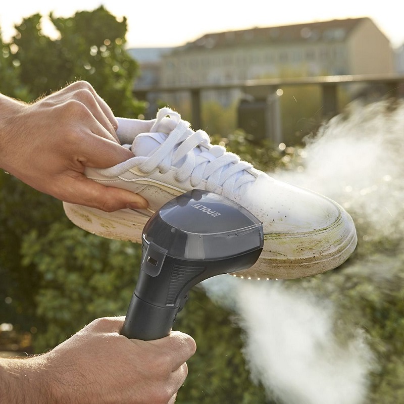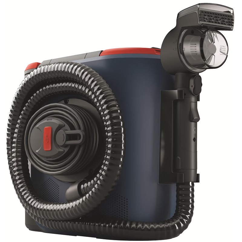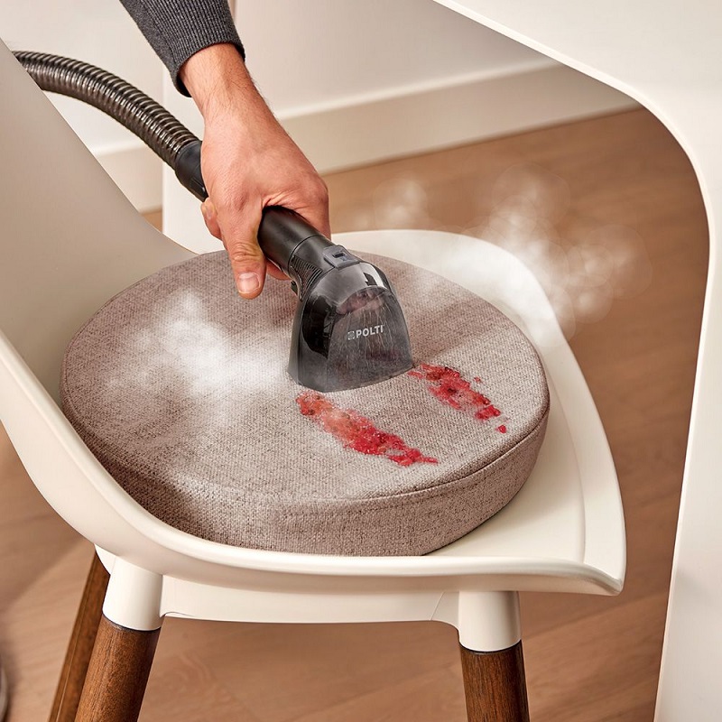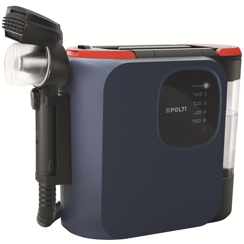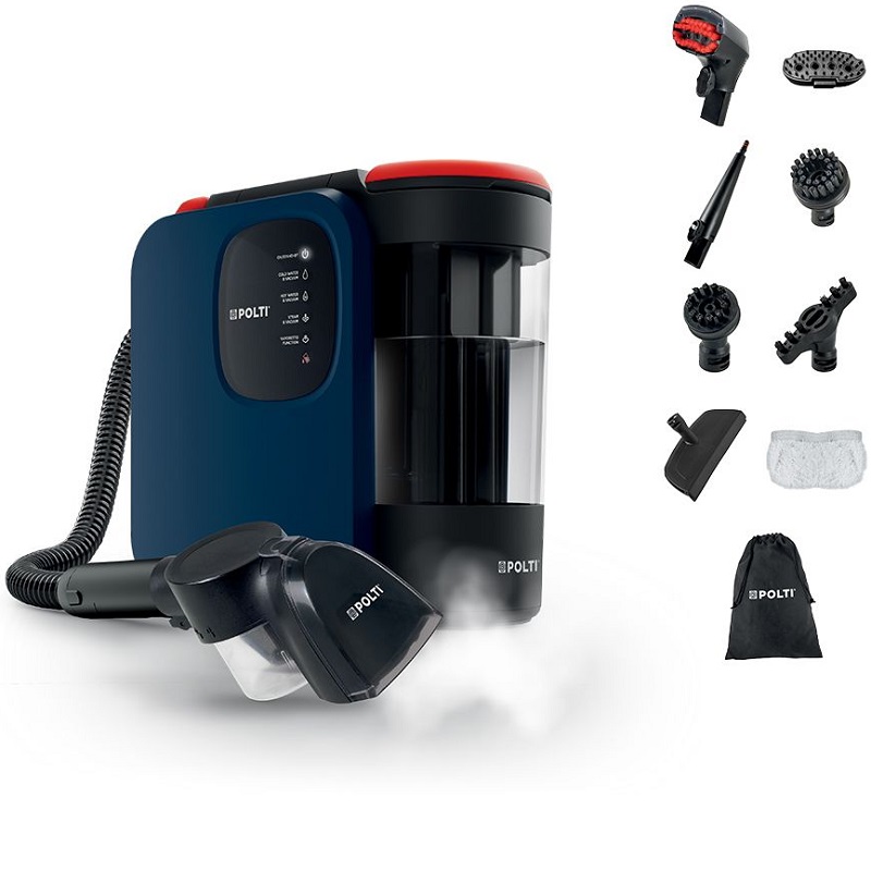 A 7.1-meter operating radius and a 1.6-meter flexible hose make it easy to reach even hard-to-access areas. The electronic controls on the handle, along with the included accessories—an upholstery nozzle and a cleaning brush—make operation particularly intuitive. Rubberized wheels protect delicate floors. Available in white and blue, this appliance is the ideal solution for cleaning textile surfaces throughout the house. It removes stains, liquids, and odors from textiles and surfaces and disinfects using the power of steam without any detergent. Steam eliminates all stains.