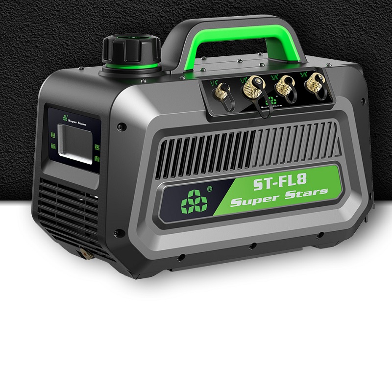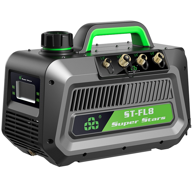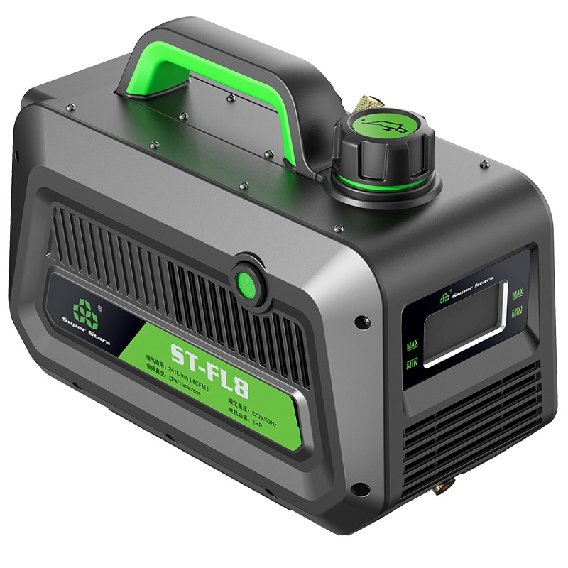 The ST-FL air-cooled vacuum pump utilizes cutting-edge technology to deliver superior performance. Designed for refrigeration and air conditioning applications, it is compatible with refrigerants such as R32, R410A, R134A, R454C, R455A, etc. It is equipped with four 1/4", 1/2", and two 3/8" inlet ports, as well as a large sight glass to prevent oil shortages and ensure rapid refills. Its omnidirectional fan maintains pump efficiency, effectively protecting machine performance.