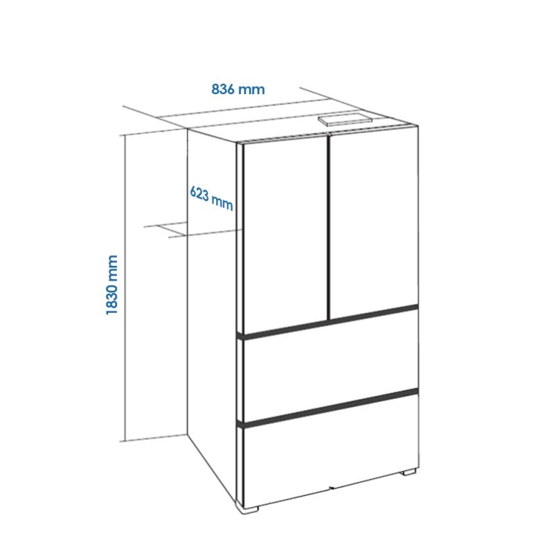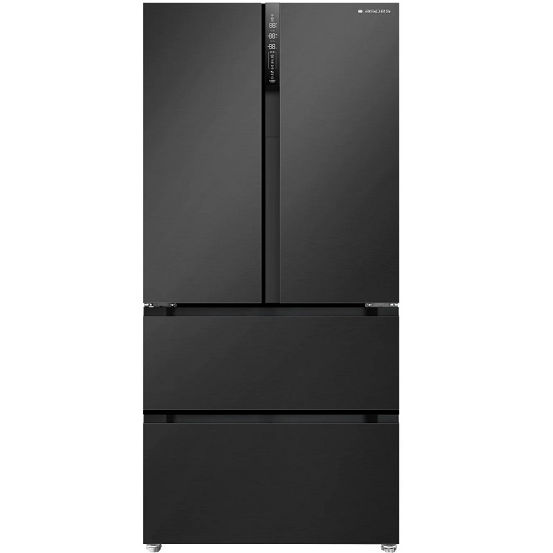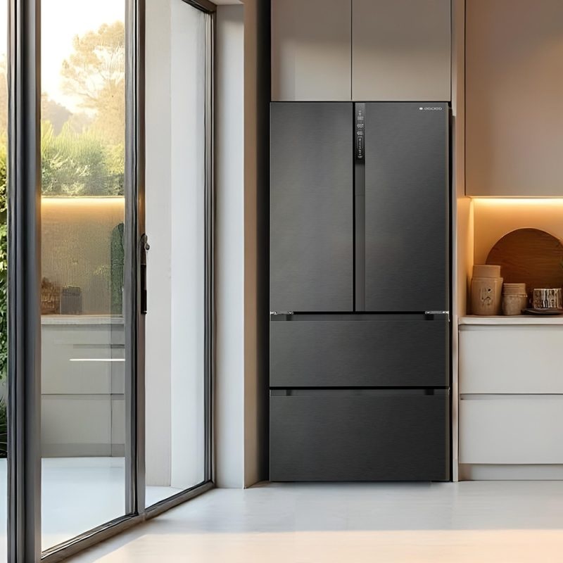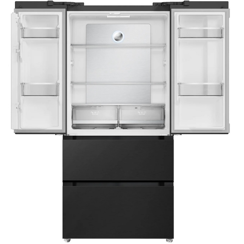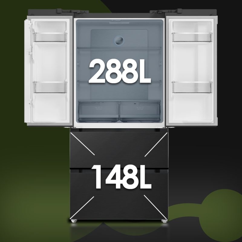 Dark stainless steel finish with four non-reversible push-to-open doors and a 90° open-space system. LED interior lighting. Touch control system with LED display, automatic defrost, and functions that optimize refrigerator performance. Total capacity of 436 liters, with a 4-star freezer and multiple compartments for optimal storage.