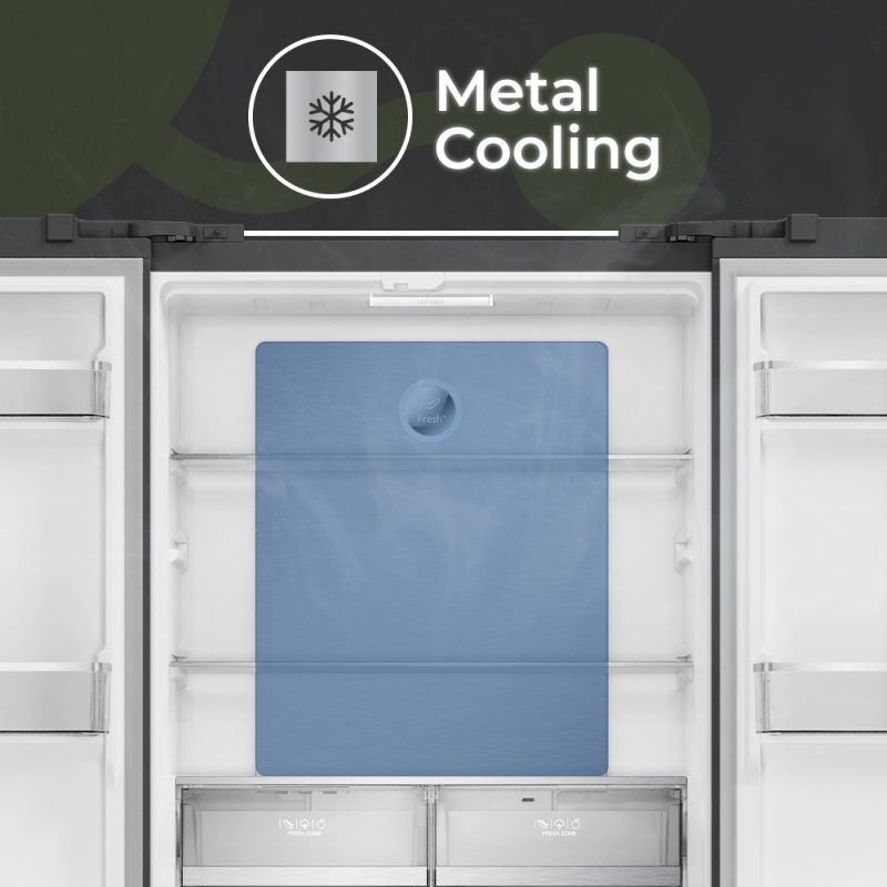 The Metal Cooling interior lining maintains an optimal cooling temperature and ensures long-lasting cooling. Thanks to the metal's excellent thermal conductivity, the metal foil retains cold air longer, even with frequent door openings and closings, by minimizing temperature fluctuations. The Zero Clearance opening system allows the refrigerator to be placed in any space. It enables the doors to open efficiently to 90°, without requiring any lateral space.