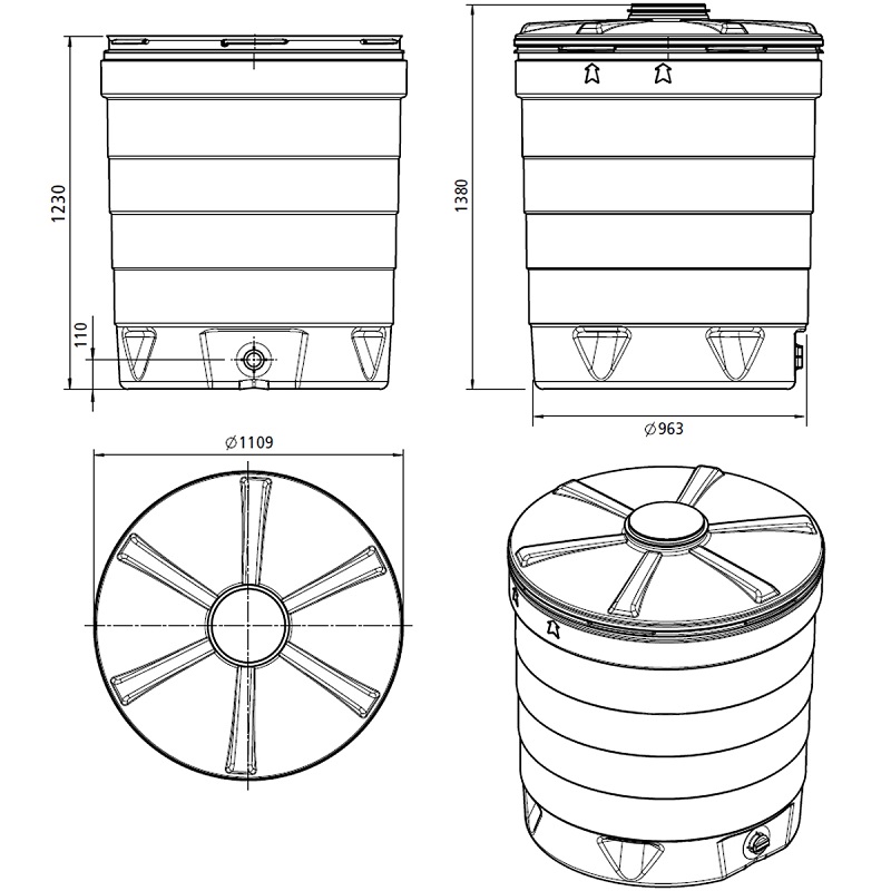 Reinforced HDPE tank with UV protection for storing drinking water and other chemically compatible liquids. Its design and fully opening lid facilitate handling for mixing and dissolving additives, fertilizers, and other chemically compatible liquids. DN 250 top lid, with the option to install a float and/or overflow. 10-year warranty. Durable