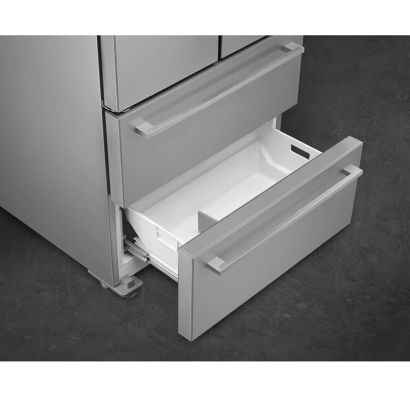 The Smeg FQ55FXDE freestanding 4-door refrigerator-freezer guarantees high performance thanks to advanced technologies that reduce energy consumption. It features a large total capacity of 539 liters, a ventilated cooling system, Total No Frost technology, and an external LED display.