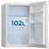This refrigerator features cyclic cooling technology, a universal compressor, and R600a refrigerant. It boasts an energy class E design and a maximum noise level of 40 dB. The white design includes a reversible, easy-open door and LED interior lighting. It offers manual controls, manual defrosting, and optimized functions for maximum performance. The total capacity is 102 liters, with a 4-star freezer compartment and multiple shelves for optimal storage.