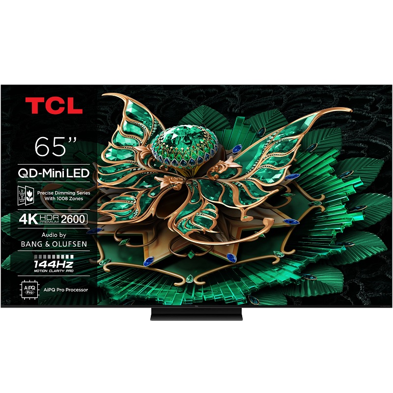 The TCL 65C7K smart TV features a 65-inch QLED Mini-LED display, an ultra-slim design, Ultra HD 4K resolution, an AiPQ Pro picture engine, a CrystGlow HVA panel, a native 144Hz refresh rate (up to 288Hz VRR), peak brightness up to 2600 nits, Bang & Olufsen audio, and the Google TV operating system.