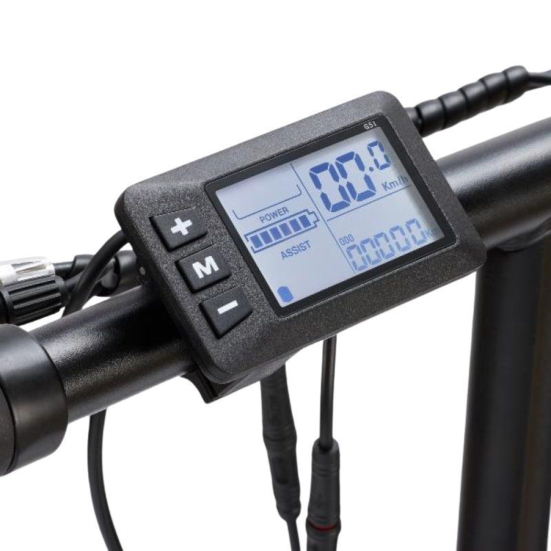 Enjoy six Shimano gears and five electric assist modes to adapt the pedaling effort to the terrain and your performance, optimizing every pedal stroke, whether you're riding in the city, the suburbs, or on a mixed route. Visibility and advanced information. Thanks to integrated LED lighting and an LCD screen, you always have essential information (speed, assist mode, battery level) under control, even in low light. The rear rack allows you to carry backpacks or panniers without compromising stability.