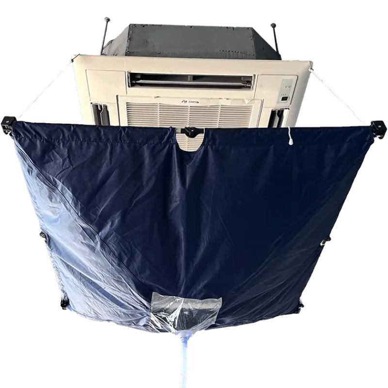 The CSC-2 ceiling cassette air conditioner cleaning bag is made of high-quality Oxford jacquard fabric, a waterproof, soft, and durable material. The retractable design easily adapts to various sizes and models of wall-mounted air conditioners and is equipped with a transparent water curtain and a water stopper, effectively preventing liquid splashes during the cleaning process. Thanks to its integrated drainage hose at the bottom of the bag, dirty water can be safely emptied directly into the reservoir.