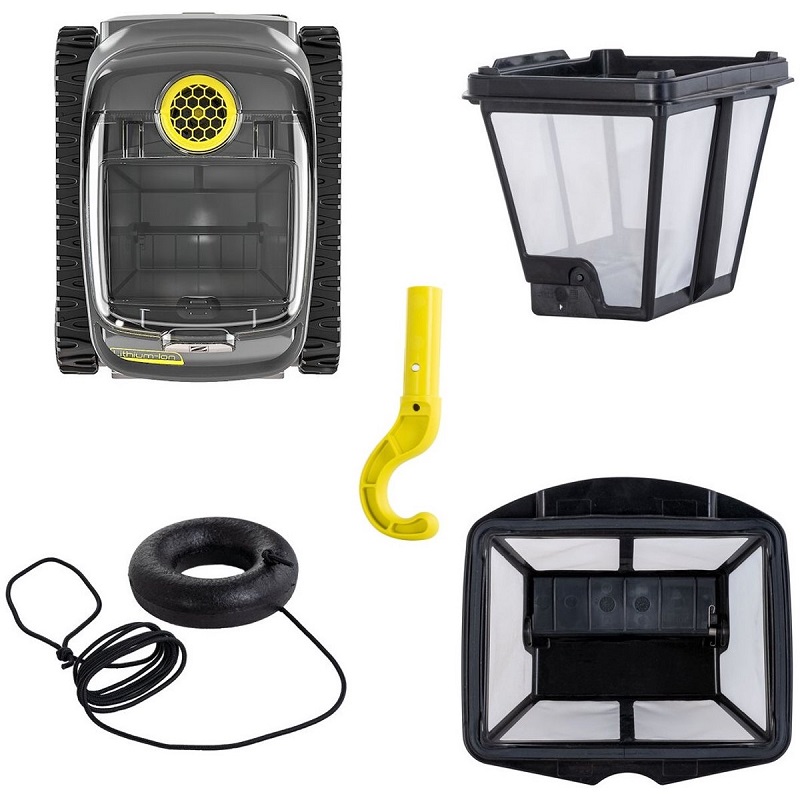 Thanks to the transparent window, you can immediately check the amount of dirt in the filter. The filter is easily accessible from the top of the robot, making filter cleaning very simple. Once the cleaning cycle is complete, the robot stops next to a pool wall for easy removal from the water. Over time, the robot will sink to the bottom and can then be easily lifted out of the water using the included hook.
